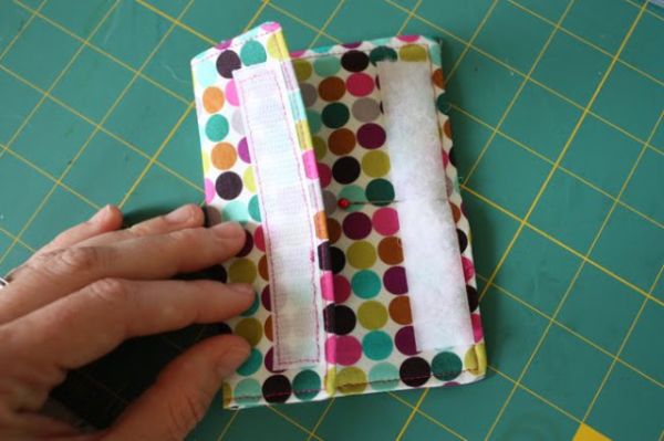 Em seguida, pegue a tira mais larga de tecido, aplique a entretela fina, dobre ao meio, passe costura ao redor, mas deixando uma abertura para virar, desvire a peça, pesponte ao redor e pregue pedaços de velcro para formar um cilindro.