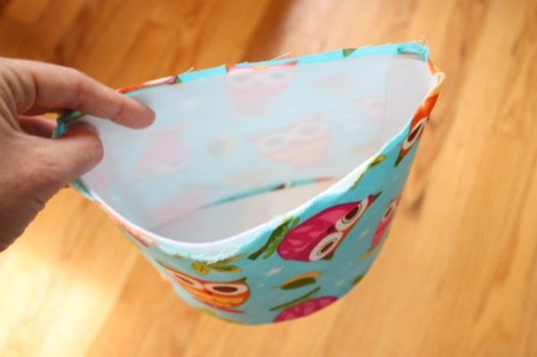 Logo após, posicione a outra cesta de tecido já costurada, que será o forro, e com as costuras para dento, dentro da cestinha com entretela, parte principal.