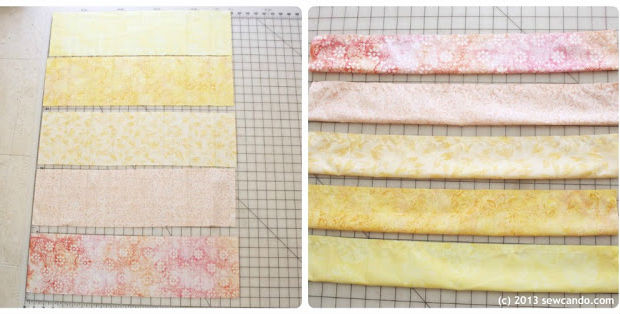 Recorte seus tecidos em tiras, como na imagem acima.