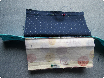 Em seguida, posicione a outra tirinha dobrada ao meio na outra ponta da peça. Alinhave, para manter no manter no lugar. Costure as duas pontas. Corte o excesso.
