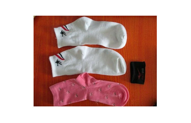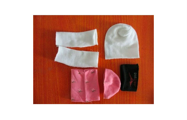 Você precisará de 3 meias: 2 brancas e 1 colorida.