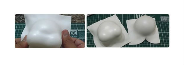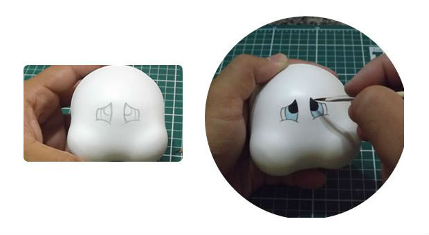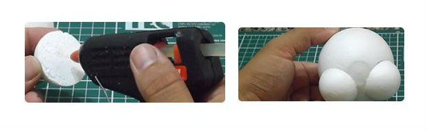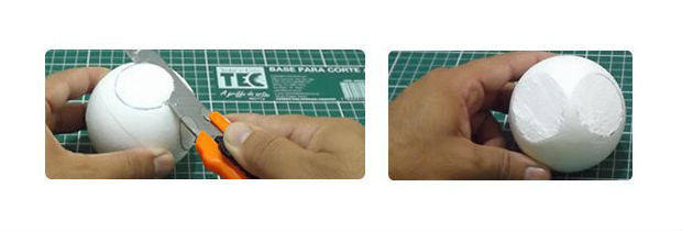 Corte um pedaço de EVA branco no tamanho de 15 cm x 15 cm e modele-o sobre a bola de 75 mm nos dois lados da mesma.