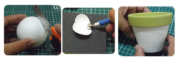 A seguir, corte a bola de 40mm ao meio e utilizando uma caneta, marque a volta da mesma na bola de 75 mm deixando entre as duas 1 cm de largura.