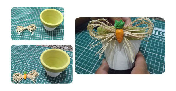 Decore um vaso de cerâmica ao seu gosto e coloque o seu coelho dentro dele.