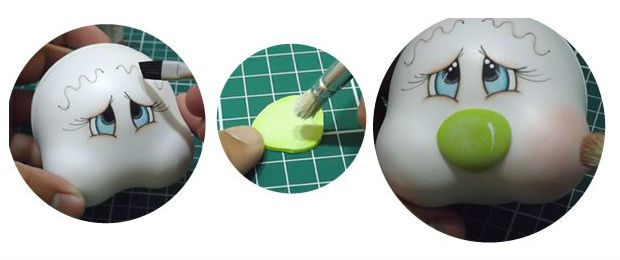 Aplique cola quente na bola de 40 mm e cole-a na bola de 75 mm.