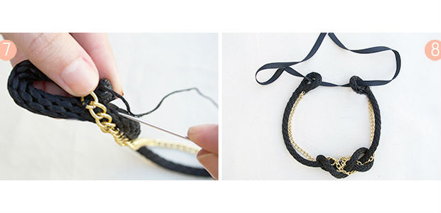 Ao costurar as pontas do seu cordão, amarre uma fita de cetim e costure tudo com linha e agulha.