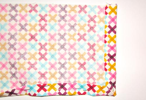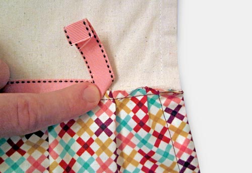 Logo após, posicione a fita escolhida sobre a emenda. E dobre a ponta da fita, para fazer um bom acabamento em seu pano de prato. Prenda com alfinetes para costura.