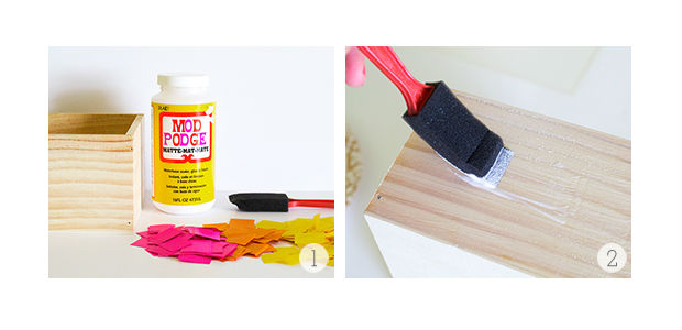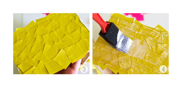 Em seguida, cole os quadradinhos de papel de seda sobre a caixa.