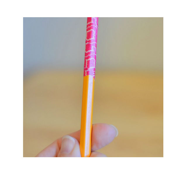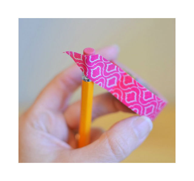 Primeiro, forre a metade do seu lápis, da borracha para baixo com fita adesiva decorativa.