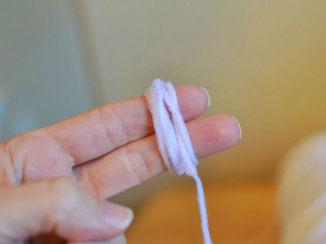 Enrole sua lã sobre dois dedos, de modo que fique bem grosso.
