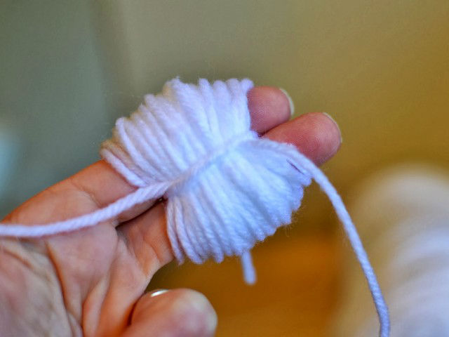 Corte um pedaço da mesma lã e amarre-a sobre o meio dessa lã enrolada no seu dedo.