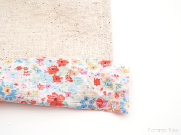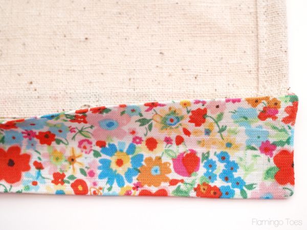 Logo após, vire o tecido para o outro lado, “encapando” a borda do pano de prato e vire uma barrinha. Passe uma costura.