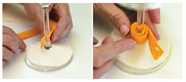 Recorte uma tira de feltro amarelo e envolva-o sobre o entorno da taça, como na imagem acima.