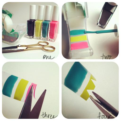 Para criar os adesivos é simples: pinte a fita adesiva (a parte não grudenta) com os esmaltes coloridos. É possível fazer o que mais gostar, mas comece com listras e triângulos. Deixe secar por cerca de 30 minutos.