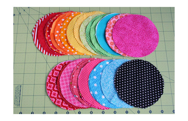 Primeiro, faça círculos de tecidos coloridos para fazer os fuxicos.