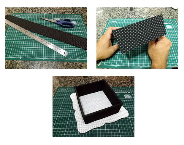 Logo, corte uma faixa de 60cm x 7cm do EVA preto de bolinhas brancas e cole-o em toda a volta do quadrado confeccionado.