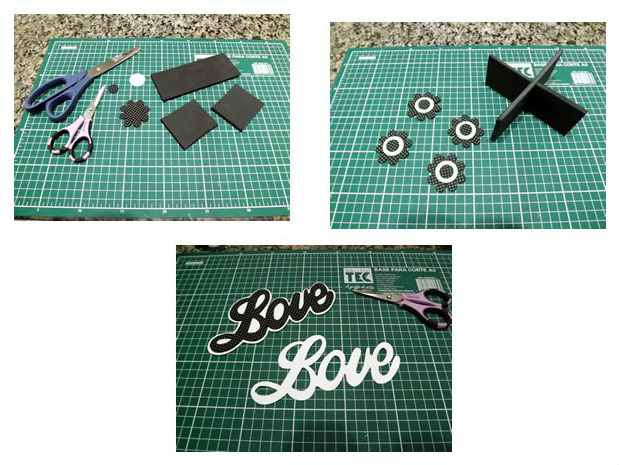 Passe a escrita “Love” para a folha de EVA e recorte-a. Loog, cole-a em cima de um EVA branco para fazer o contorno.