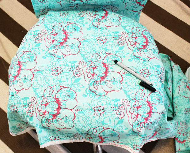 Com a parte de trás da cadeira de frente para você, apor outra grande parte do tecido para a cadeira para trás com fita adesiva. Faça uma grande marca na parte superior central do encosto da cadeira. Seguir a toda a volta do perímetro da cadeira para trás, desenhando uma linha reta na parte inferior de alguns centímetros abaixo de onde a cadeira de volta encontra o assento da cadeira. Corte 1/2 “em torno do perímetro da seção que apenas rastreado. Marque esse pedaço “banco de trás Piece,” e defini-lo de lado por agora.