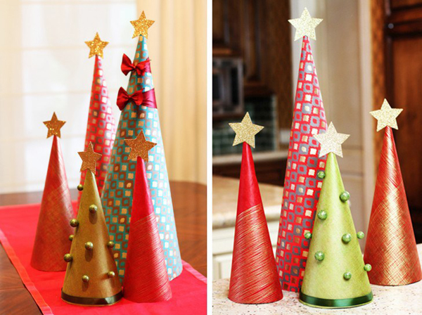 Faça um cone de papel e cole fios ao redor, com o auxilio de fita adesiva dupla face. Grampeie na borda um enfeite de sua preferência. Coloque dentro do cone um pisca-pisca.