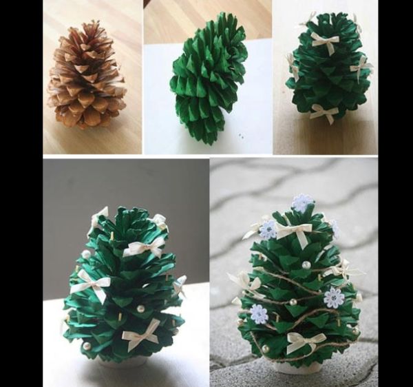 Pinte uma pinha de verde, coloque-a dentro de um vasinho ou suporte e enfeite-a com os aviamentos que desejar.