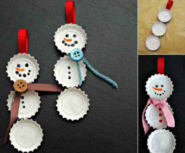 Entre os processos de como fazer enfeites de Natal, está o enfeite de árvore de Natal feito com tampas de garrafa. Pinte 3 tampas com tinta branca e cole-as, com cola quente, em um pedaço de fita dobrado. Enfeite seu boneco com tintas coloridas, botões e fios em geral.
