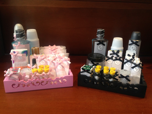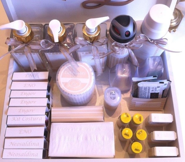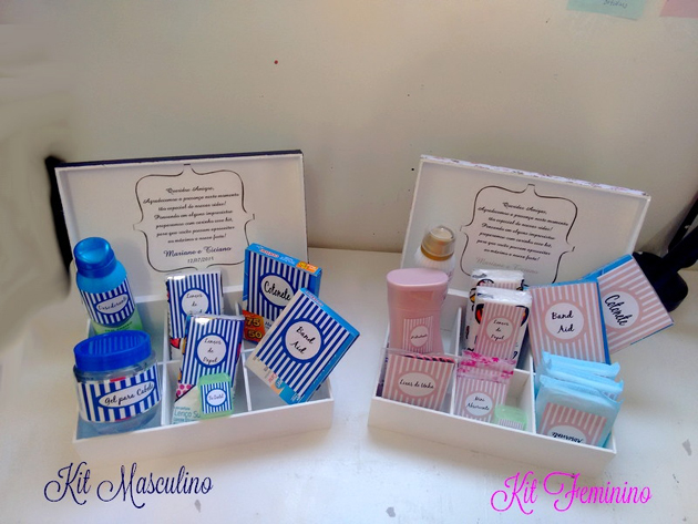 Este kit é colocado tanto no banheiro feminino quanto no banheiro masculino, porém você deve adequar o kit para cada sexo. No banheiro masculino o kit pode ser menor e mais voltado para medicamentos, por exemplo, já no kit feminino itens de beleza e maquiagem também podem ser implementados.