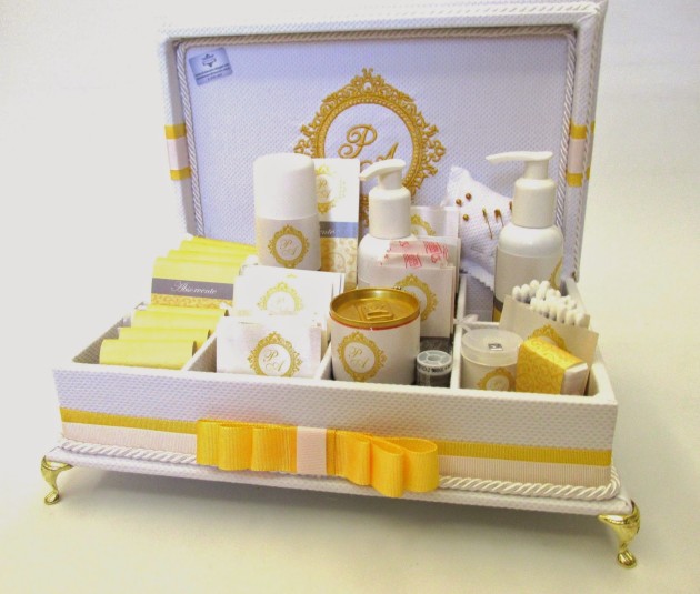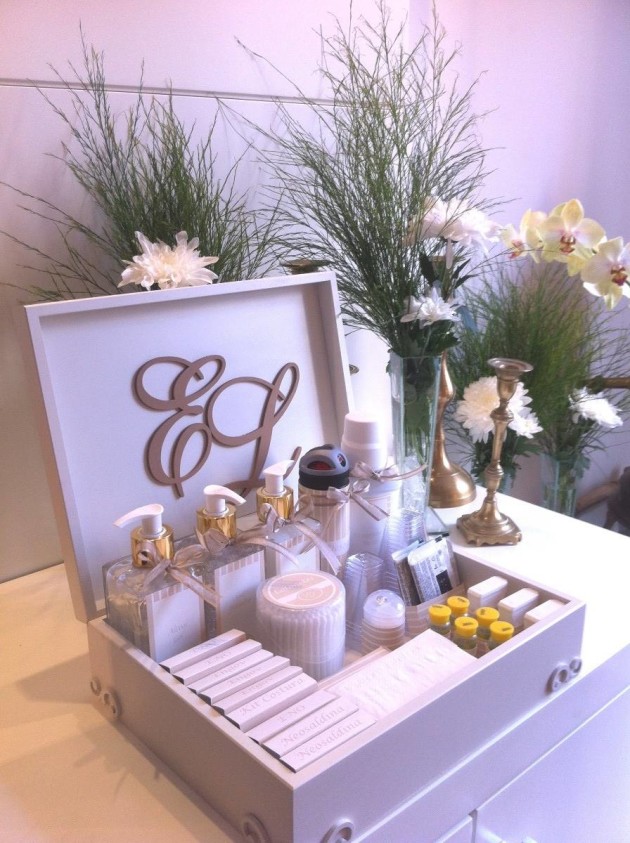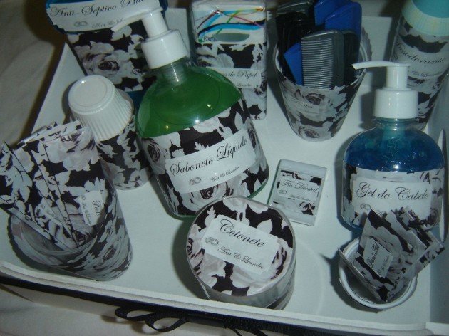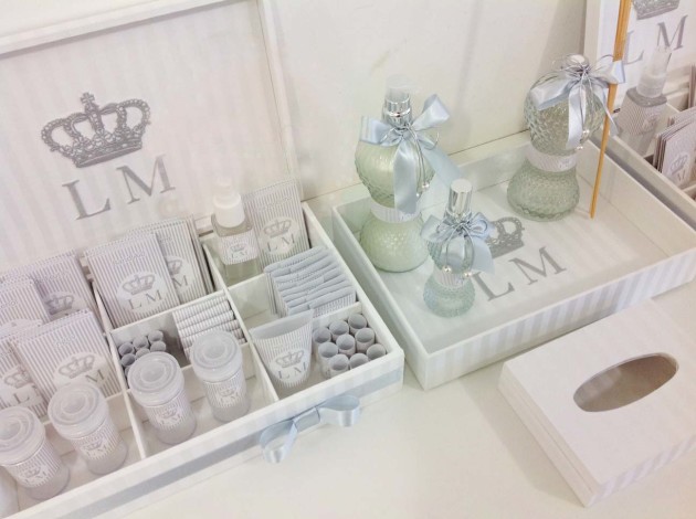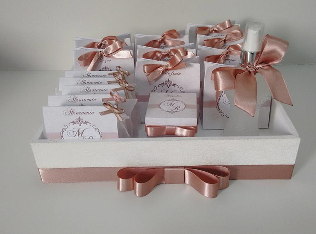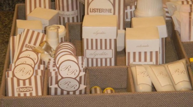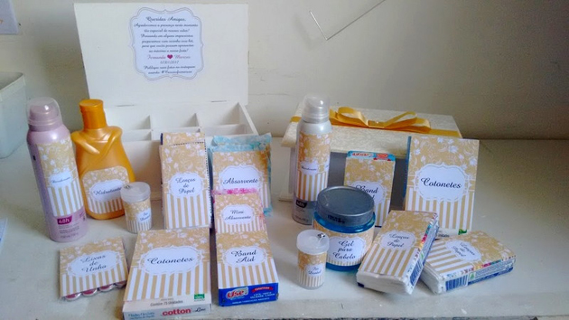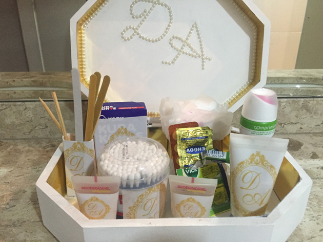 Coloque o seu toque pessoal no seu kit, que pode ter bandeja ou caixa de sua preferência e decorada também de acordo com a sua preferência. Você pode escrever seu nome, a inicial dos noivos ou até uma mensagem, na peça que serve como embalagem para o seu kit lavabo. Você também pode imprimir etiquetas personalizadas para cada item do seu kit.