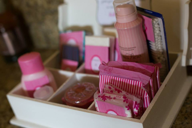 O kit toalete feminino pode ser bem mais amplo e você pode criá-lo de ordo com o orçamento disponível para este item de sua festa. Seu kit feminino para lavabo pode conter, além dos itens já mencionados para o kit masculino: