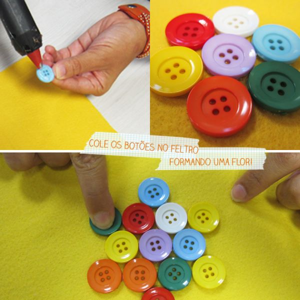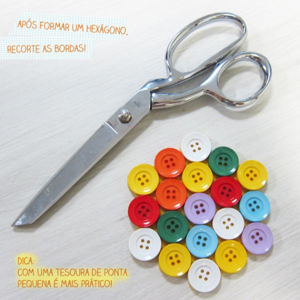 Agora, para finalizar a sua peça, assim que a cola estiver totalmente seca, basta recortar ao redor dos botões, de forma bem rente, e com o auxílio da tesoura comum. E está pronto!