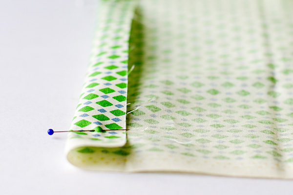 Comece cortando o tecido escolhido com o tamanho que você desejar e em formato de quadrado. Depois, na parte que será a borda superior, dobre uma barra e prenda com o auxílio de alfinetes para costura.