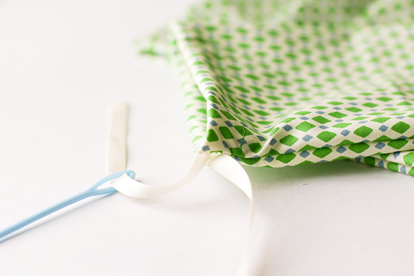 Agora, passe a fita escolhida por um alfinete de segurança ou por uma agulha grossa e comece a passar pela barra do saquinho de tecido.
