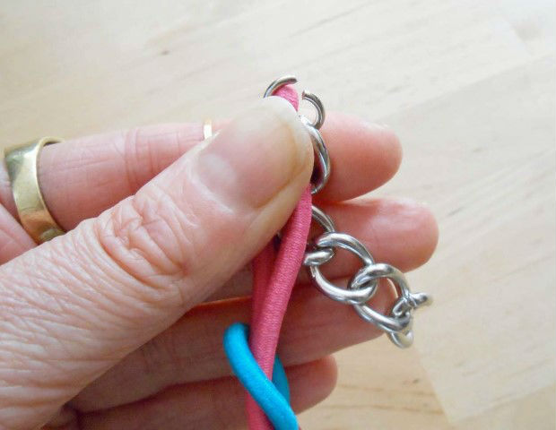 Encaixe uma argola na ponta da corrente e prenda essa argola em um dos rabicós.