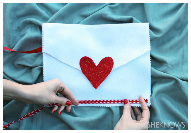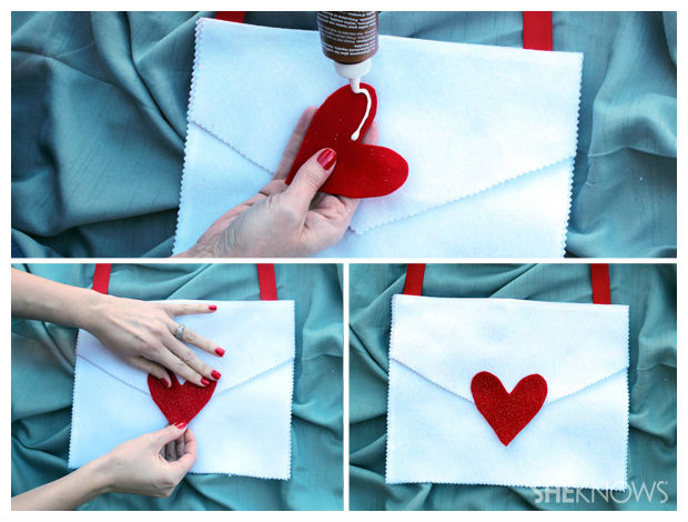 Agora, com o pedaço de feltro vermelho, corte um coração para colocar sobre o ponto da aba do envelope, de modo a tornar-se um selo.