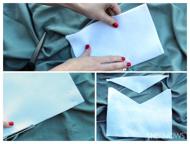 Para a aba do envelope, coloque a peça modelada de feltro em cima do terceiro pedaço de feltro branco, com os lados errados juntos.