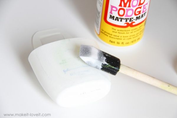 Logo após, aplique cola para decoupage na parte menor do vidro de shampoo.