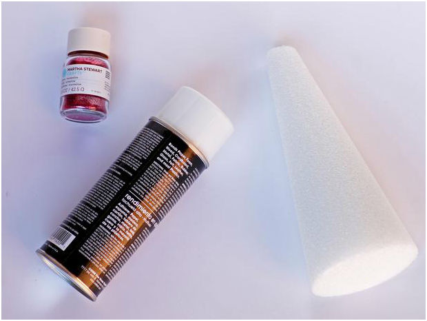 Em seguida, aplique spray adesivo sobre o cone de isopor para poder dar início à aplicação de purpurina.