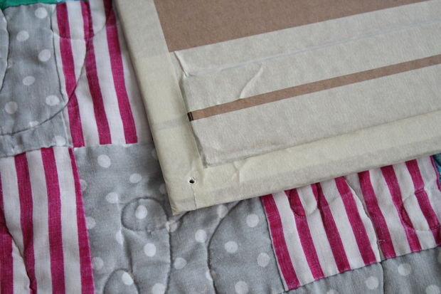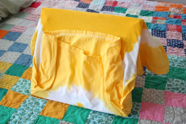 Dobre as partes que sobraram da camiseta e cole ou costure.