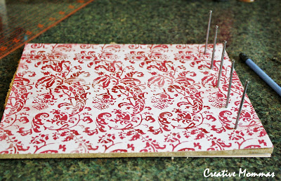 Logo após, corte o papel ou o tecido escolhido com o mesmo tamanho da peça de madeira ou da peça de MDF e cole-o. Então, pregue todos os pregos nesta parte, mas mantendo um espaço entre um prego e outro que permita acomodar os carretéis ao final do seu trabalho.