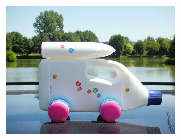 Acima você confere um lindo carrinho feito com embalagens vazias de amaciante (uma pequena e uma grande), além de algumas tampinhas e alguns adesivos decorativos.