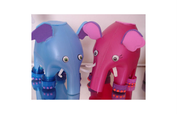 Na imagem acima você confere lindos elefantinhos confeccionados com embalagem de amaciante vazia.