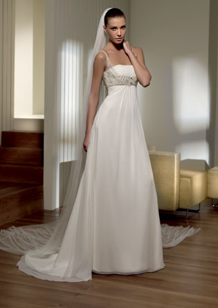 O modelo império é também muito sofisticado. Nele, a região do peito é mais justa, e logo abaixo o vestido começa a se abrir. Os decotes podem ser os mais diversos, seja com ou sem mangas. É possível idealizar uma peça mais simples ou algo cheio de rendas e bordados.