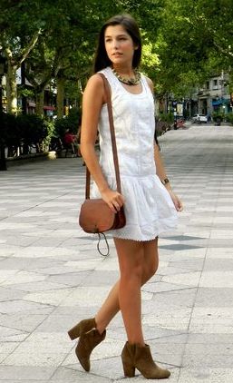 O ideal durante o verão é usar botinhas com cano curto, porém este tipo de bota, quando usado com vestido, tende a cortar e, consequentemente, achatar toda a silhueta, por isso não é indicado para mulheres baixinhas ou gordinhas (neste caso quando a silhueta é achatada ela tende a parecer mais larga). Para as baixinhas e gordinhas o correto seria usar uma botinha cor da pele, assim a bota não cortaria a perna, pelo contrário, a alongaria.