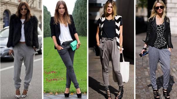 Veja como as calças de moletom podem compor looks bastante modernos e chiques. A peça, geralmente em tons de cinza, contrasta com peças pretas ou coloridas, e ganha sofisticação com os saltos.