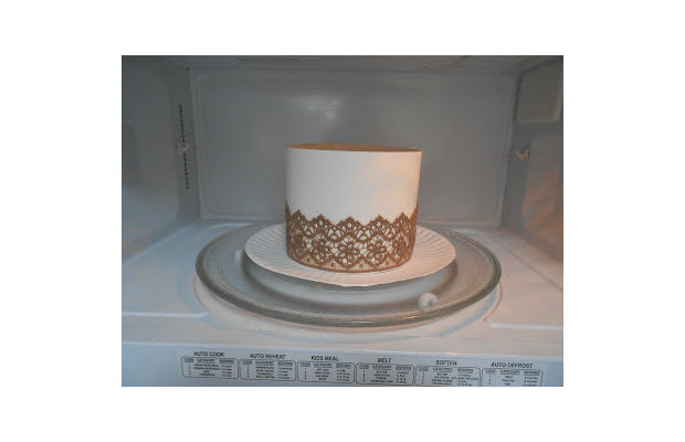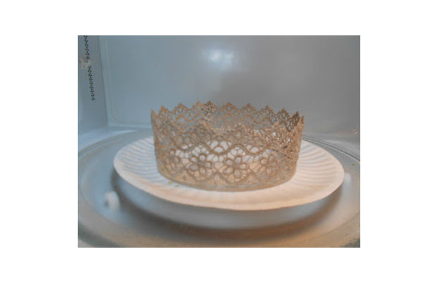 Ao tirar do micro-ondas, a sua renda terá endurecido, formando a sua coroa.