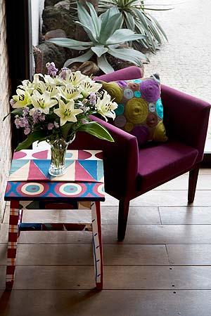 Mesinhas de canto revestidas tão um toque irreverente ao ambiente.