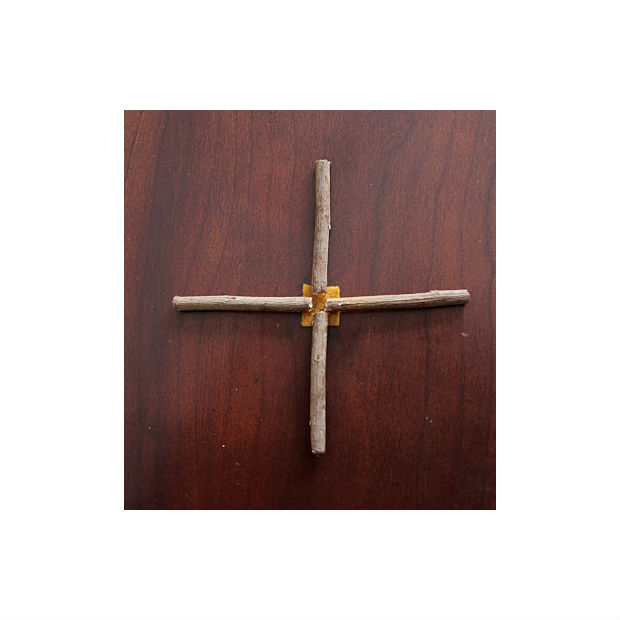 Com a cola quente, cole os 4 pedaços grandes de galho, como na imagem acima, sobre o quadrado de feltro.