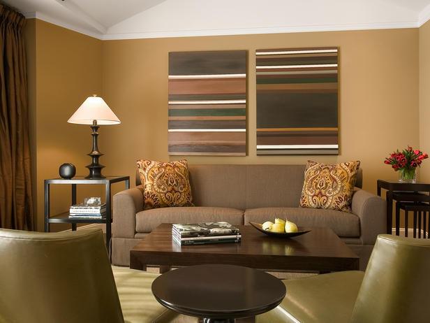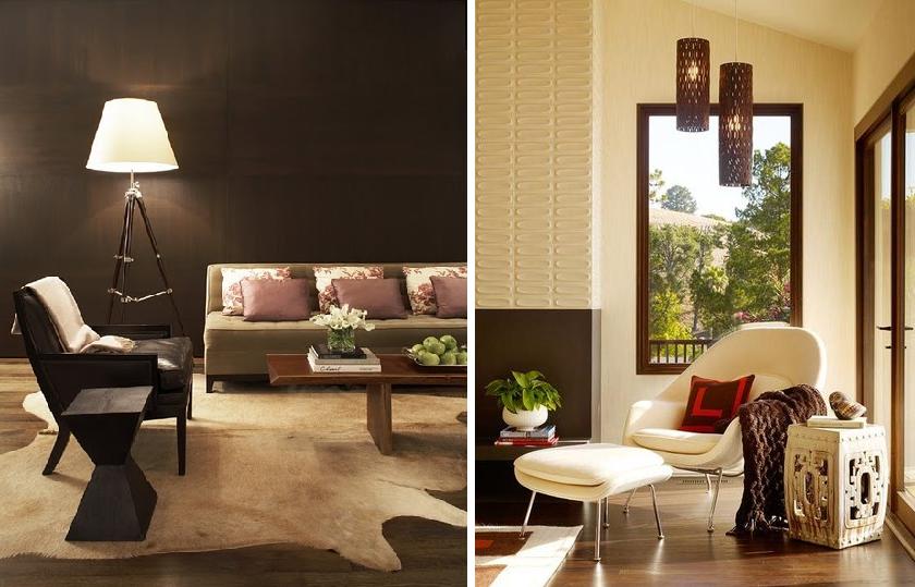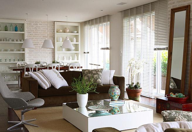 É possível criar um ambiente decorado predominantemente em marrom e acrescentar pontos de luz e irreverência através de objetos coloridos, como almofadas, cortinas, tapetes, luminárias.