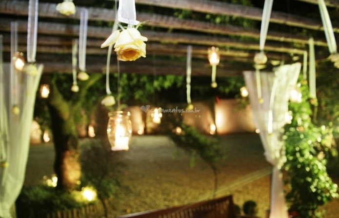 Além de muita vela em todo o ambiente, para dar aquele toque romântico e elegante, decore o teto do ambiente onde será realizada a festa do seu casamento com flores.