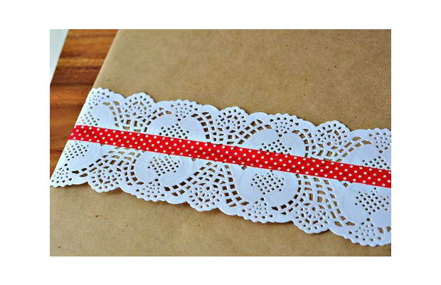 Posicione duas faixas de toalha rendada sobre a embalagem de presente e uma o material com uma fita adesiva colorida e estampada.