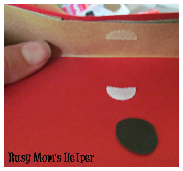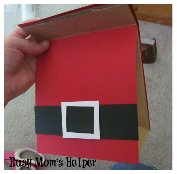 Faça uma fivela de cartolina branca e cole sobre a faixa preta para formar o cinto do Papai Noel.